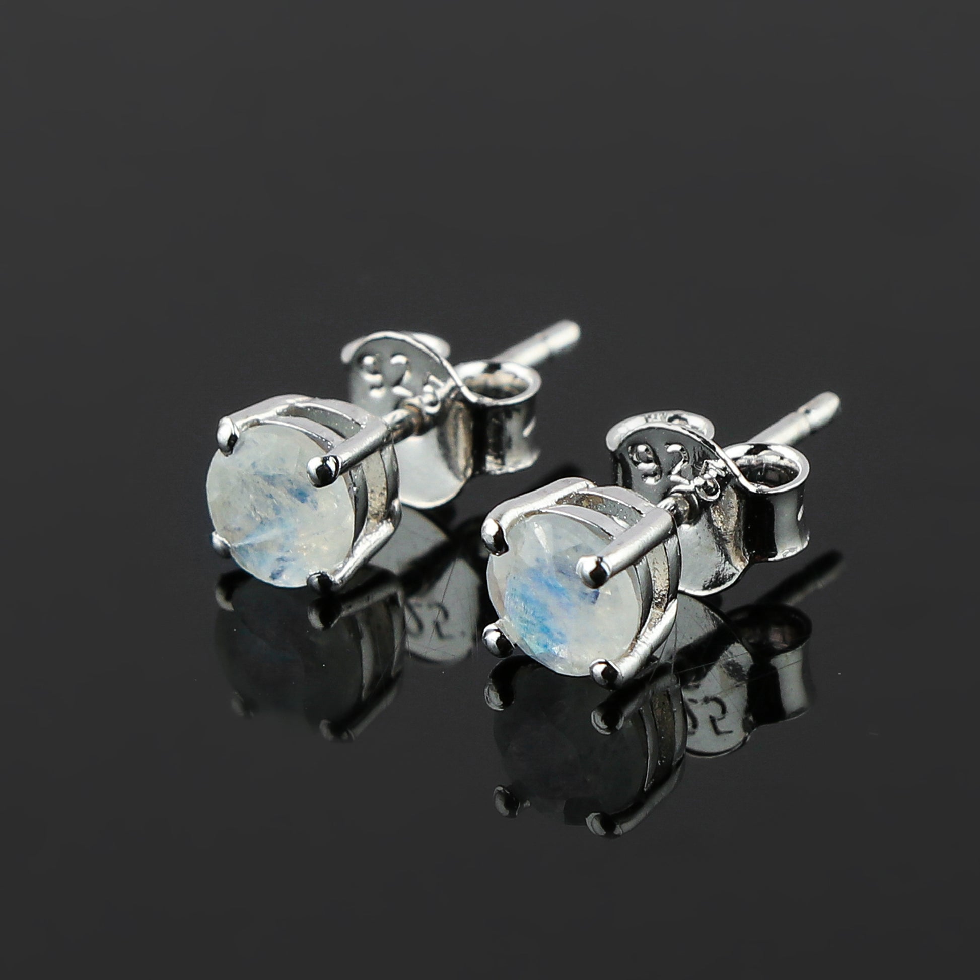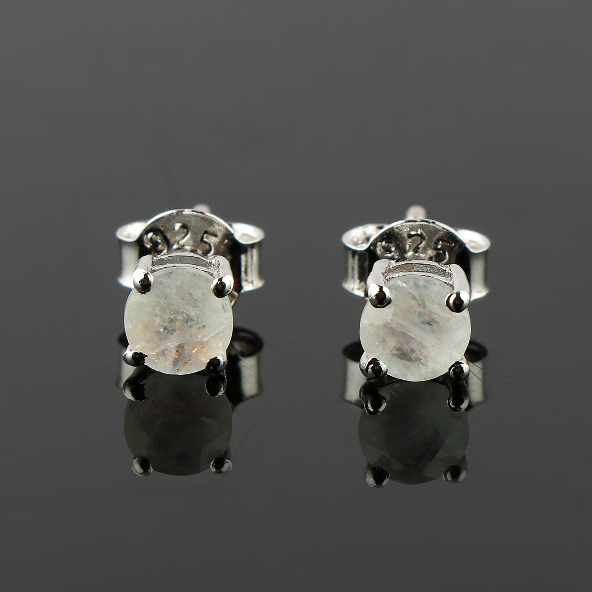 Explore the stunning collection of fine jewelry with these Natural Moonstone Round Stud Earrings featuring 5x5 mm brilliant-cut rainbow color stones. Styled in Prong type, crafted with an AA++ quality and rhodium-plated 925 sterling silver makes these gemstones versatile in nature which can be wore in any occasion. Moonstone are believed to enhance intuition and emotional balance of the wearer.
